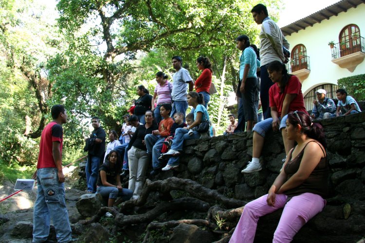 Telling the story of La Rodilla Del Diablo. The devil was being chased and tripped. His knee left this whole which filled with water. It's an underground spring and this supplies all the water for the park.